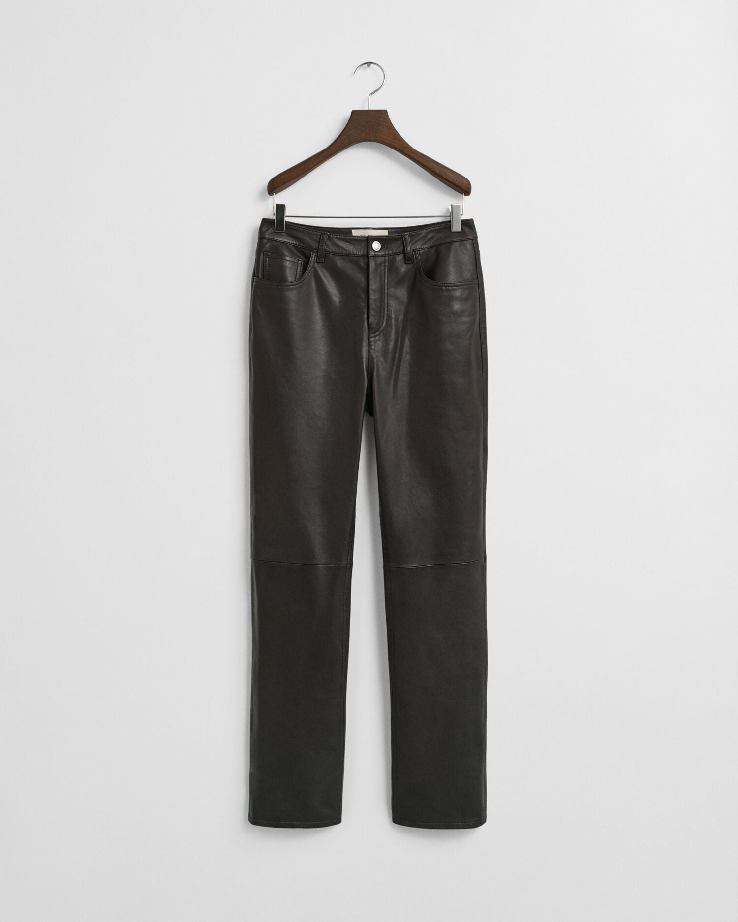 These stylish leather pants are designed for a regular fit and feature a mid-rise waist and straight, full length leg. Crafted with a five-pocket design, they are detailed with seam lines just below the knee, branded denim buttons, and zip fly opening.