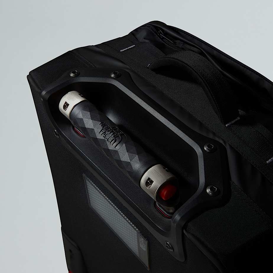 • Our iconic Base Camp Voyager Duffel is the inspiration for this new roller. Made from durable yet lightweight recycled polyester tarpaulin with a rock-solid chassis, it's built to handle a beating when being transported around the world. But it's not just tough; it's really practical, too. The two smooth-rolling wheels and the wide telescoping handle make this rolling bag comfortable when hauled through airports and around town. There's a 15" sleeve on the inside to keep your laptop safe. And the large internal compartment features a zipped divider to help keep dirty shoes or wet gear away from your clean clothes. But while there's plenty of room for travel essentials, compression straps help you find space for a little more. Not to mention there are extra pockets both inside and out for quick and easy access to your passport, phone, wallet and keys.