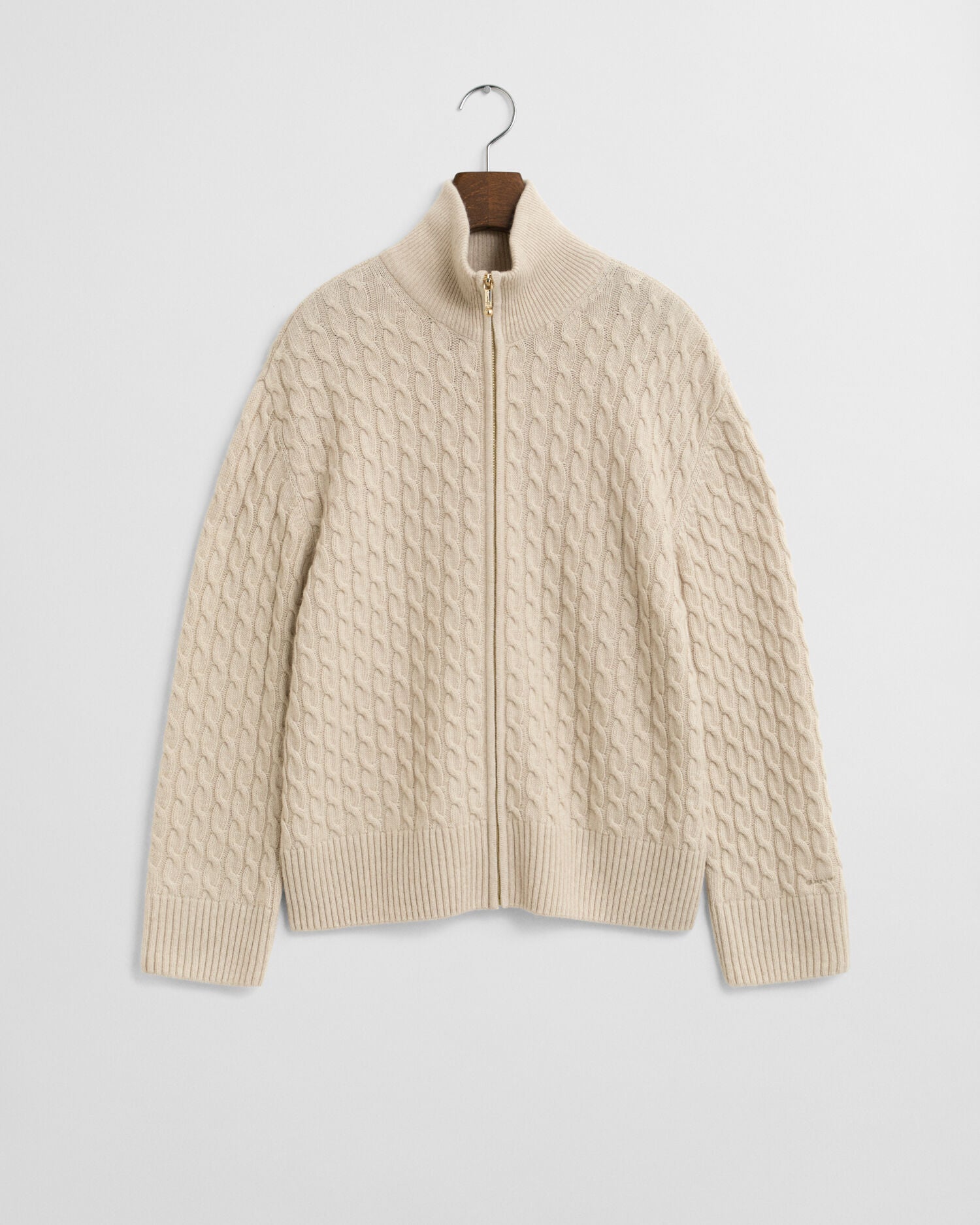 Crafted from a premium blend of Italian wool, viscose and cashmere, this sweater is designed with a relaxed fit and features an all-over cable knit construction. The design has a double ribbed zip-up collar, a two way zipper and stylish ribbing at the sleeve cuffs, neck and hem. This garment is intended for a relaxed fit. For a closer fit, we recommend sizing down.