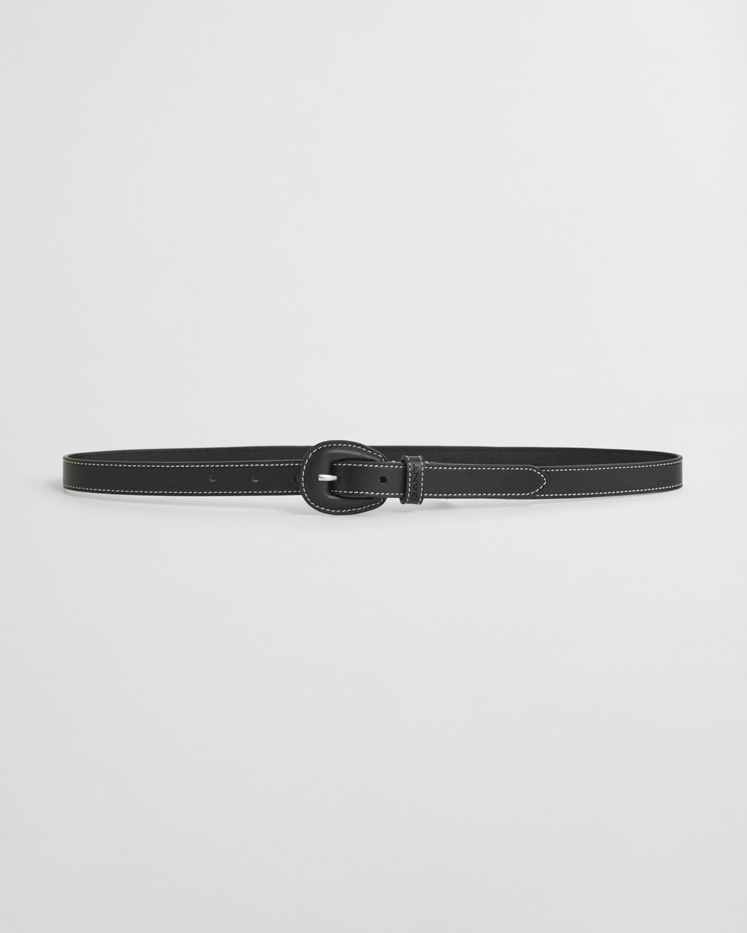 Crafted from 100% leather with contrast colored stitching, this slim belt is a simple yet sophisticated accessory. It features a leather-covered buckle and a leather keeper debossed with the logo.