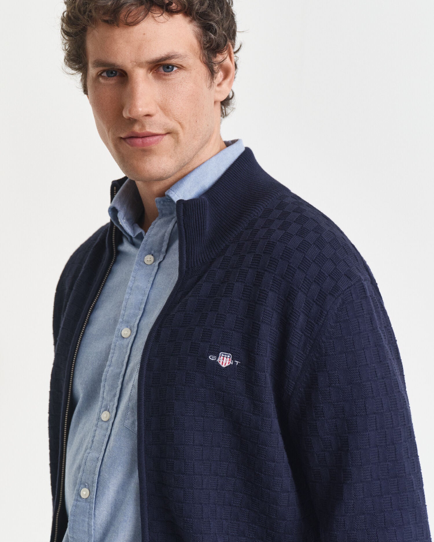 Crafted in a textured cotton knit and cut in a regular fit, this zip-up sweater features a shield graphic embroidered at the chest. This sweater is the perfect layering piece for all season long.