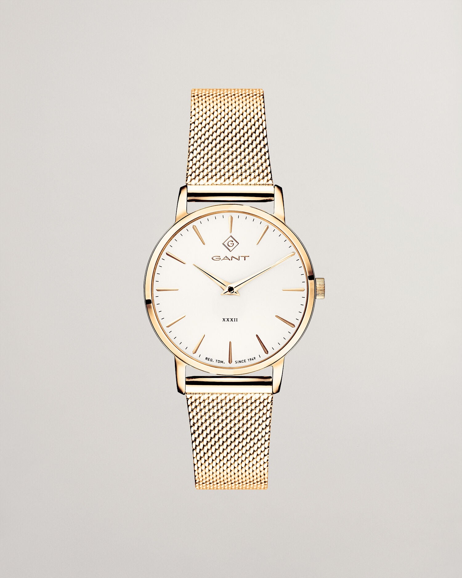 A watch is more than an accessory. Using luxe materials, we've crafted a women's collection in tribute to our history of iconic American sportswear. The Park Avenue 32 Wristwatch is made in stainless steel with gold-ion plating with a milanese strap and features two hands.