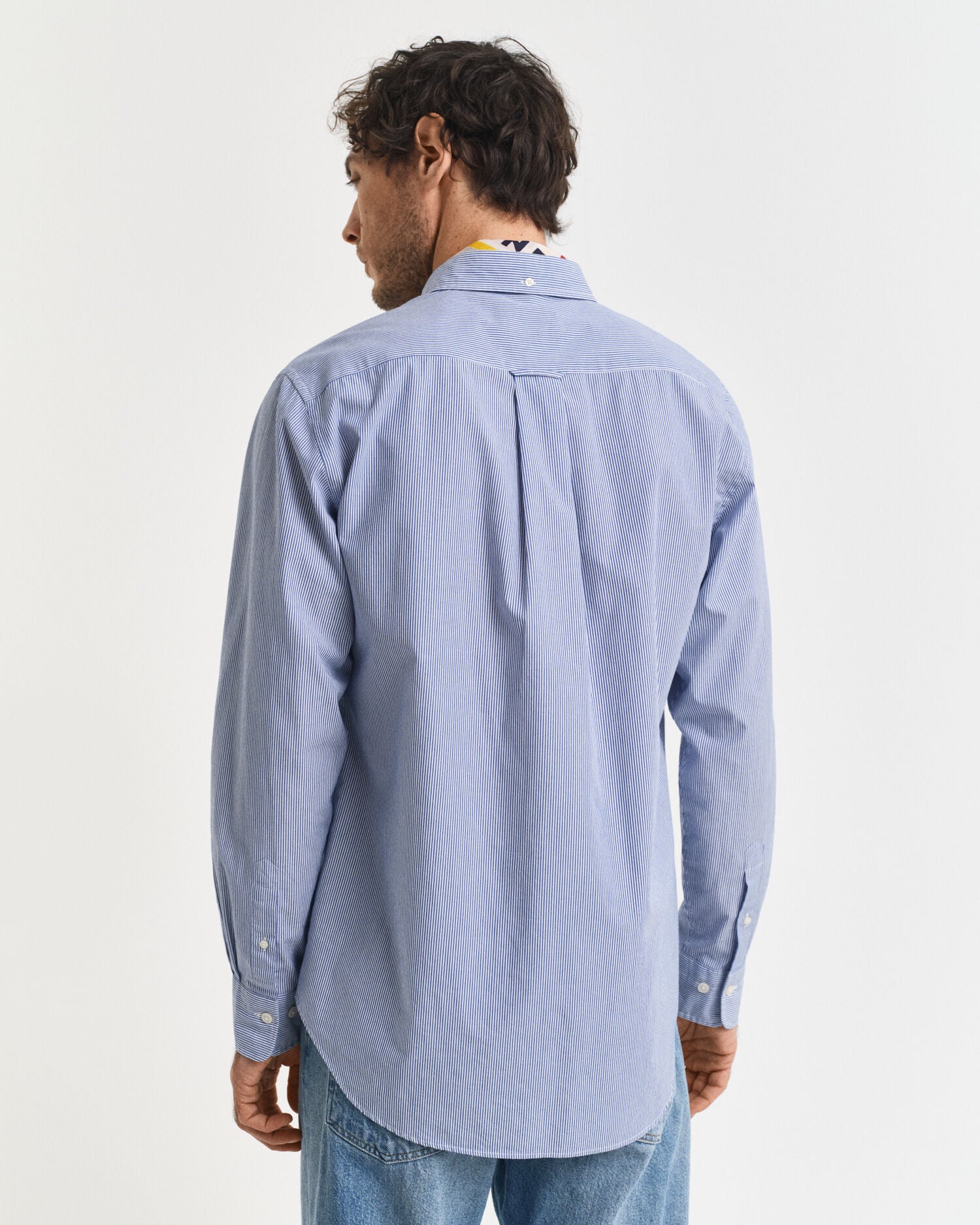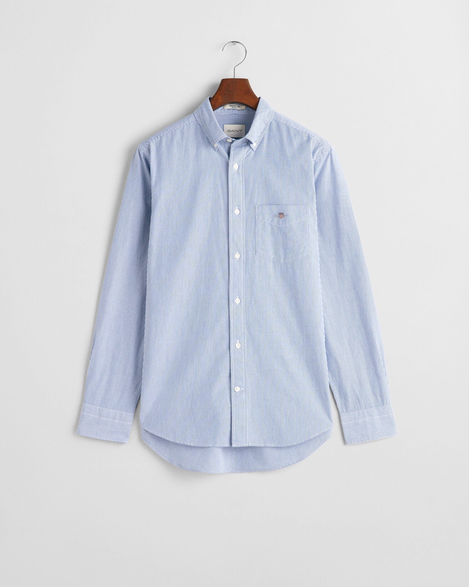 Crafted in a durable cotton poplin, this classic shirt is essential to any preppy wardrobe. Designed with a classic Banker Stripe throughout the garment, this shirt is cut for a regular fit and features a button-down collar, curved hem and a box pleat with our signature locker loop at the back. It is accented with an '80s-inspired shield graphic embroidered at the chest pocket.