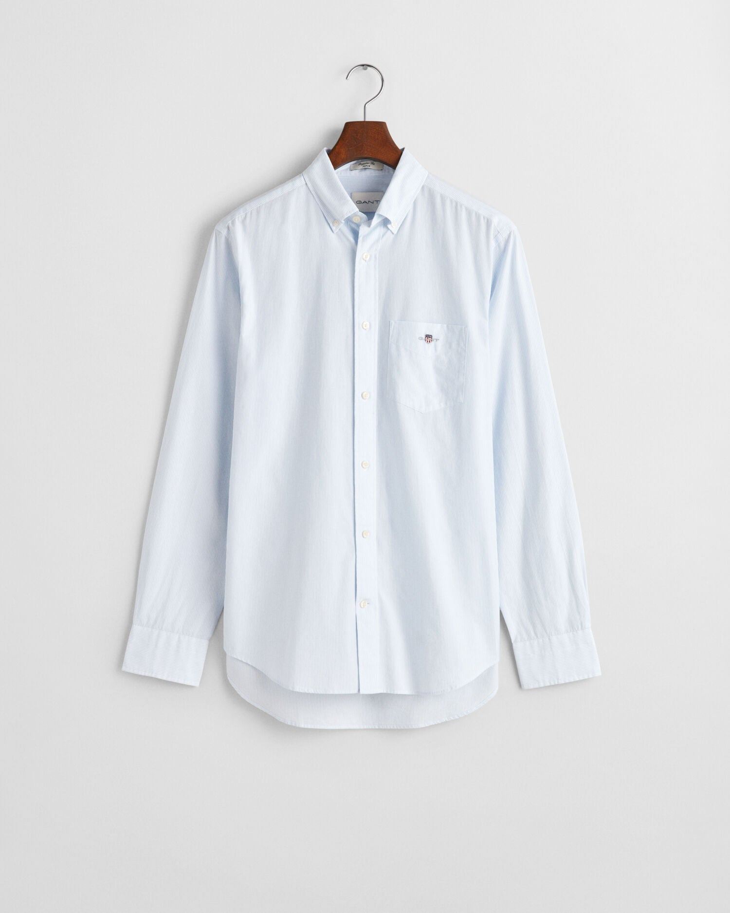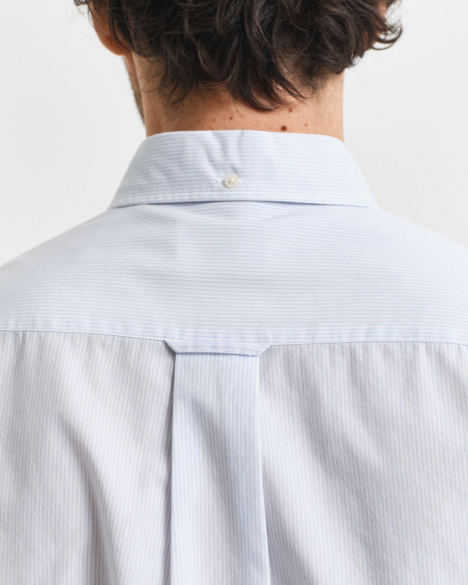 Crafted in a durable cotton poplin, this classic shirt is essential to any preppy wardrobe. Designed with a classic Banker Stripe throughout the garment, this shirt is cut for a regular fit and features a button-down collar, curved hem and a box pleat with our signature locker loop at the back. It is accented with an '80s-inspired shield graphic embroidered at the chest pocket.