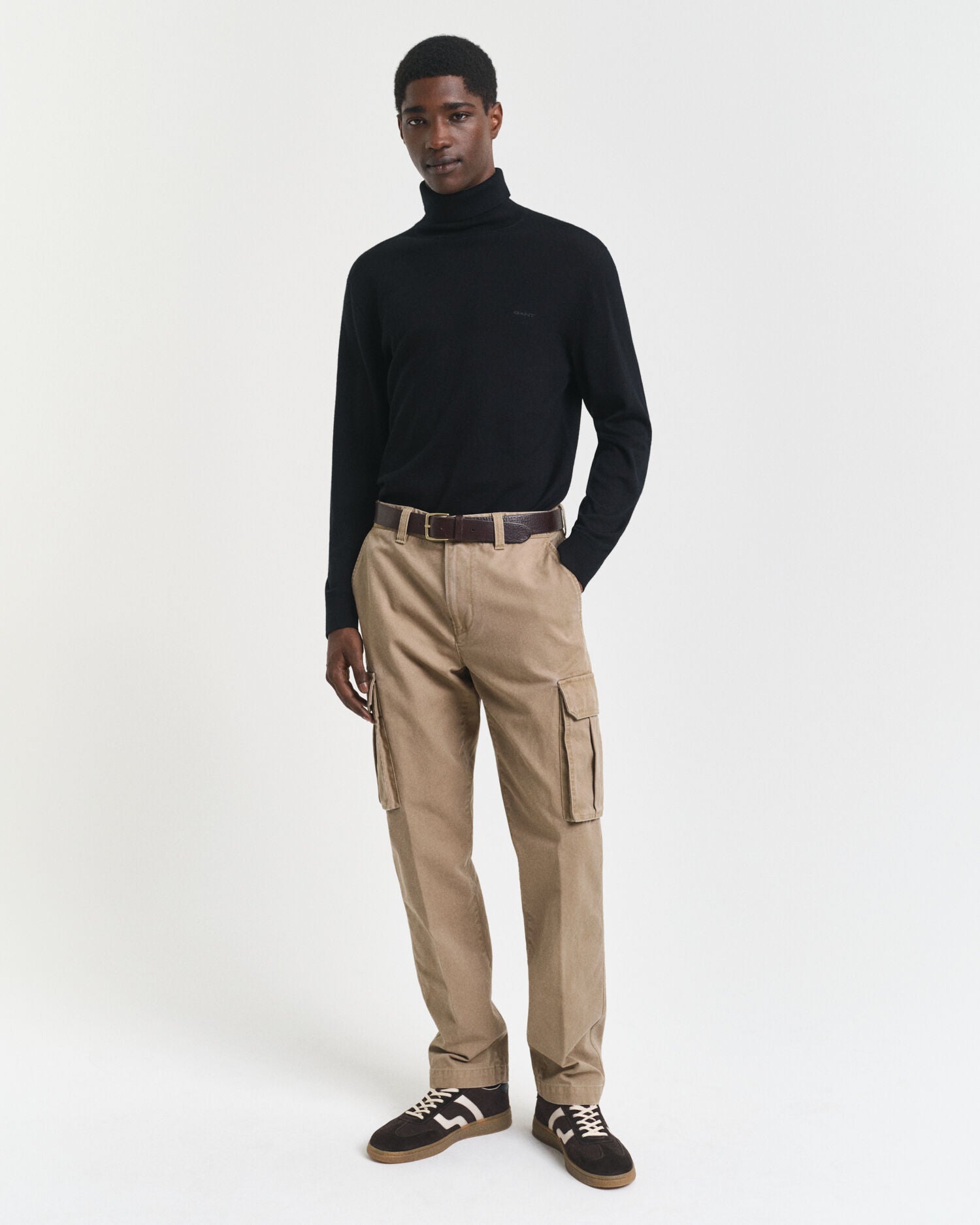 Constructed out of medium-weight brushed cotton twill, these cargo pants are the perfect addition to any wardrobe. Designed for a regular fit, they have a mid-rise waist, straight leg and slight taper below the knee. Details include front button closure, slanted front pockets, box pleat cargo pockets and back flap pockets. To complete the design, the pants also feature imitation horn buttons and an embroidered logo above the right pocket.