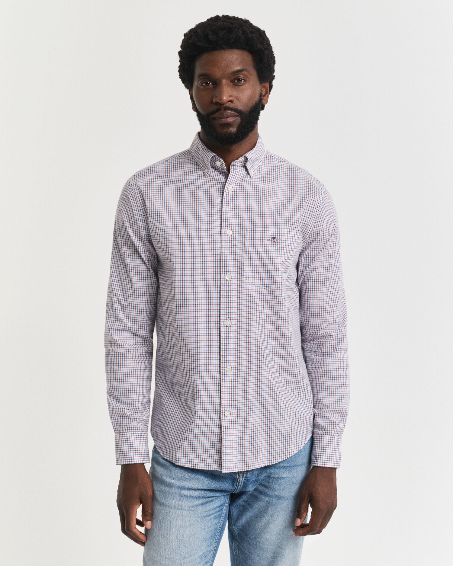 Crafted in a durable cotton poplin, this shirt is essential to any preppy wardrobe. Patterned with yarn-dyed micro checks, this shirt is cut for a regular fit and features a button-down collar, curved hem and a box pleat with our signature locker loop at the back. It is accented with an '80s-inspired shield graphic embroidered at the chest pocket.