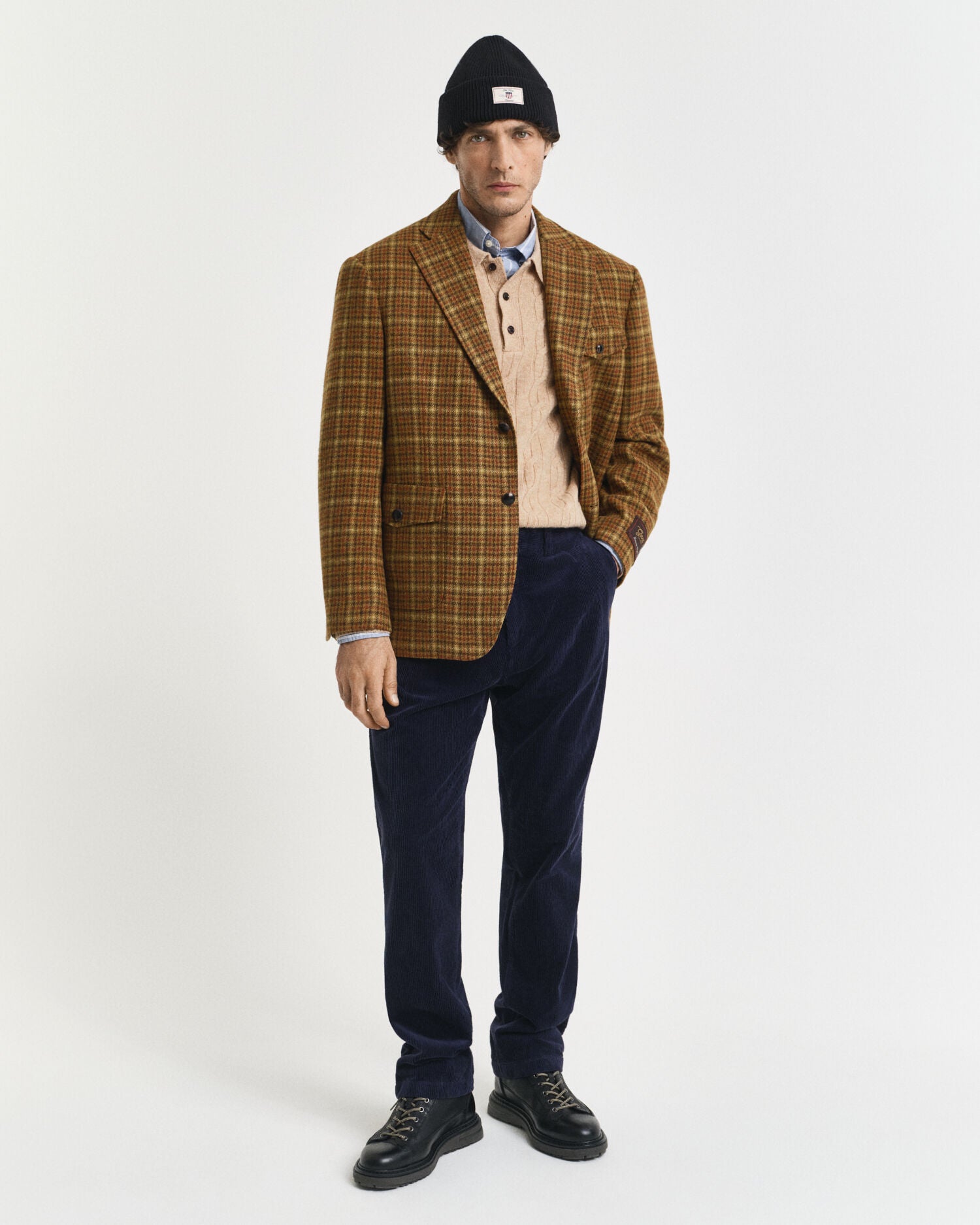 Tailored from Italian wool with an authetic tweed look, this blazer leads the way in modern tailoring. It is designed with a heritage Gun Club check and fully lined in certified viscose. This blazer is cut for a relaxed fit with wide shoulders and a length that sits just below the hips. Single-breasted with a two-button closure, it features notch collar and lapels, and felt under the collar. Other design elements include lower patch pockets, a chest flap pocket, three interior pockets, horn shank buttons and a single back vent. This blazer is also detailed with a removable description label at the sleeve. This garment is intended for a relaxed fit. For a closer fit, we recommend sizing down.