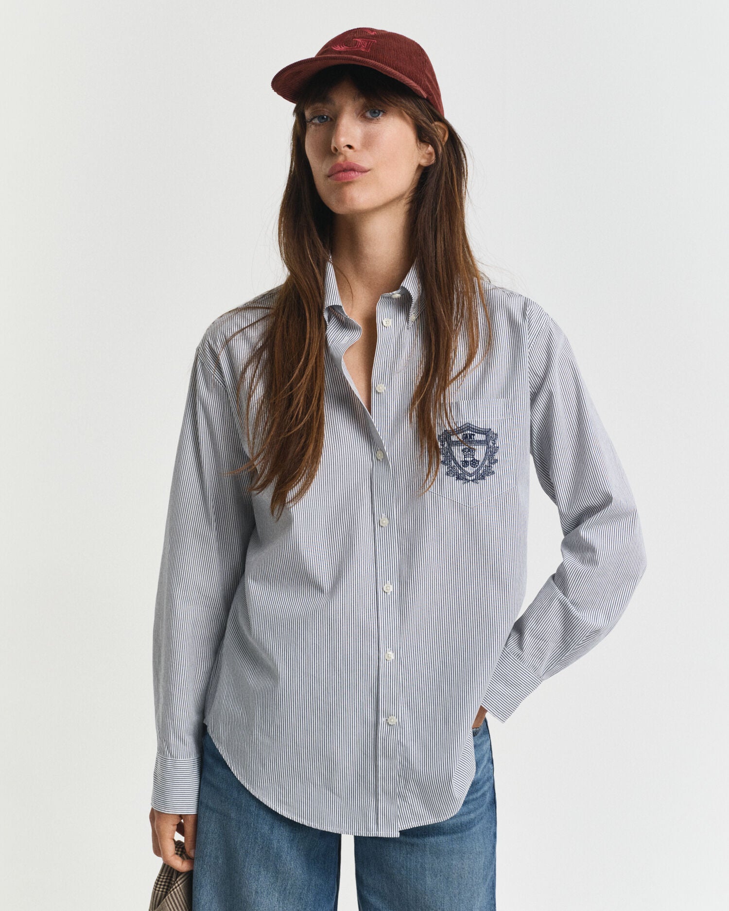 Cut in a relaxed fit, this cotton poplin shirt is patterned with yarn-dyed stripes. It features all of our signature shirt accoutrements a button-down collar, adjustable cuffs, a curved hem, and a box pleat with our innovative locker loop at the back. It is detailed with a seasonal crest graphic embroidered at the chest pocket. This garment is intended for a relaxed fit. For a closer fit, we recommend sizing down.