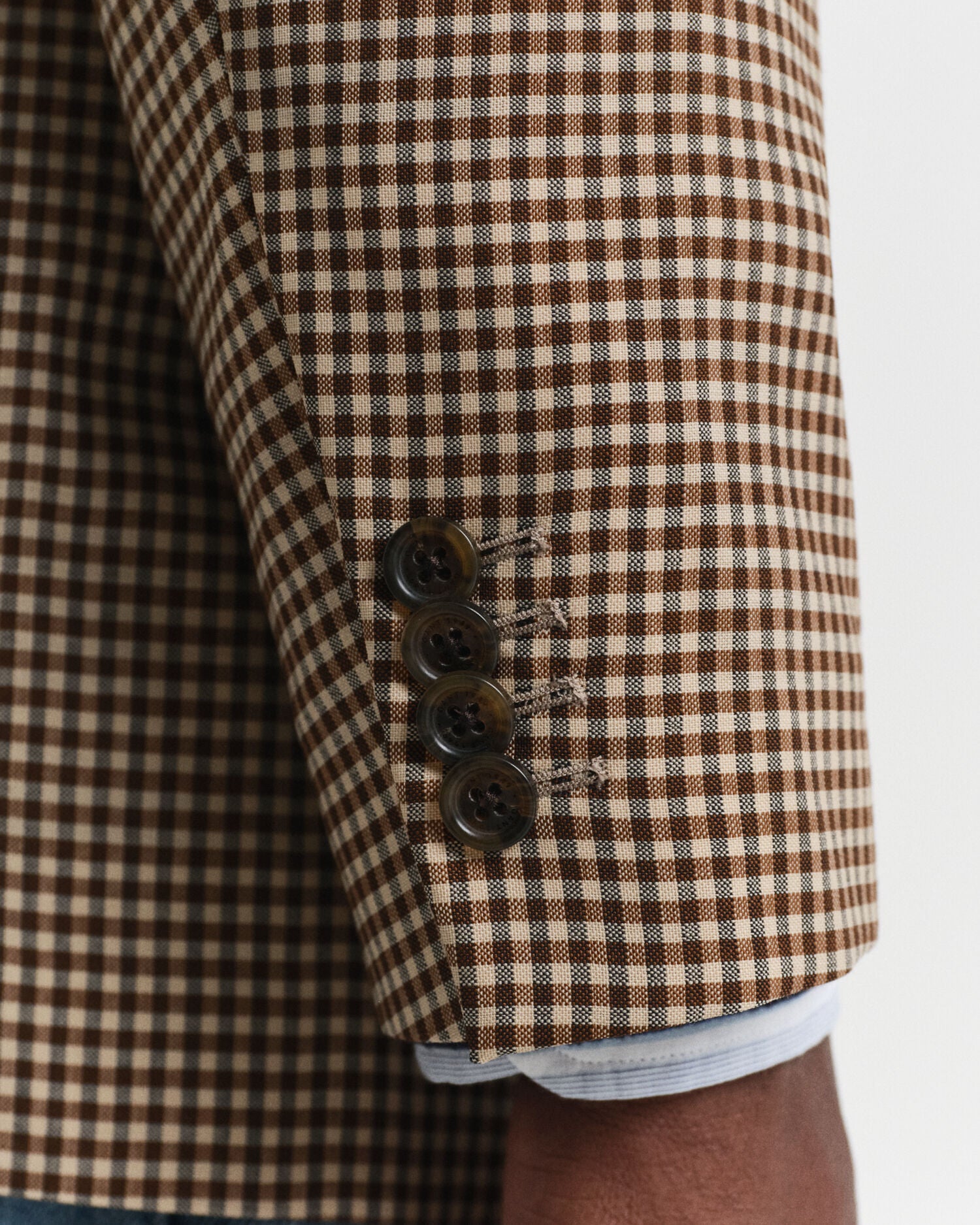 Tailored in Italian wool with a gingham check design, this blazer has a relaxed fit, wide shoulders and a length that falls just below the hips. Designed with a single-breasted front, it features a 2-button closure, notch lapels, buttoned cuffs and a back vent. Fully lined, this blazer is detailed with felt at the undercollar, bio horn buttons and a sleeve label for an added touch of branding. Fitted with three interior and outer pockets, this blazer features two front patch pockets and a chest welt pocket. This garment is intended for a relaxed fit. For a closer fit, we recommend sizing down.