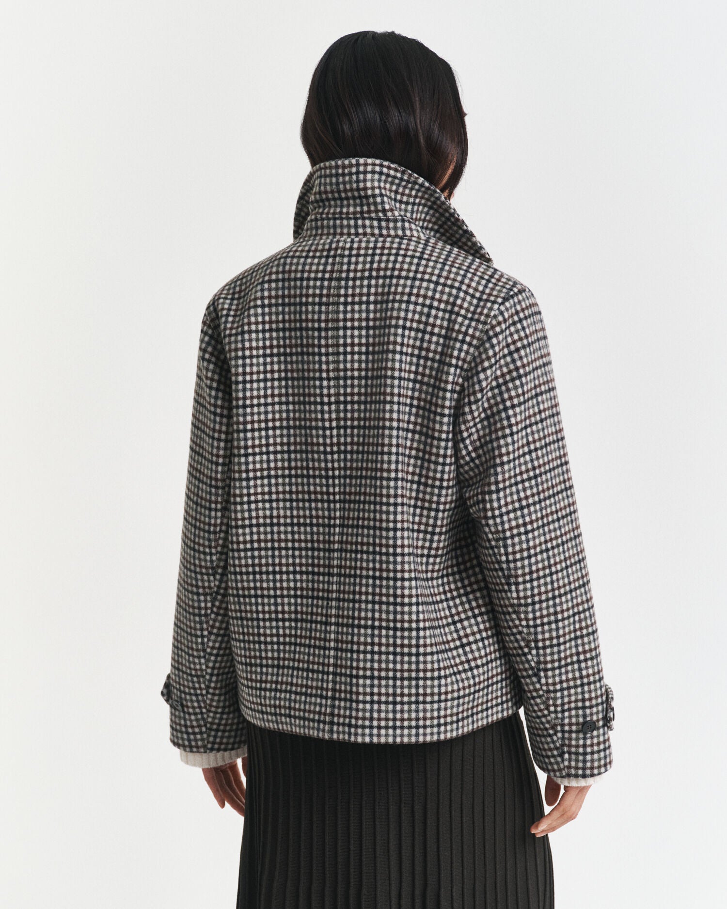 Featuring an all-over yarn-dyed check pattern, this car coat is the perfect fall-winter essential. Crafted in a premium wool blend with a twill weave, this coat is designed with a regular fit that sits at the hips. It is fully lined in a recycled synthetic and viscose blend with a branded jacquard pattern. Other details include a hidden button closure for a streamlined look with the only exception being the exposed top button. It is fitted with front welt pockets, a single interior pocket, a shirt collar, branded imitation horn buttons and tab adjustors at the sleeves.