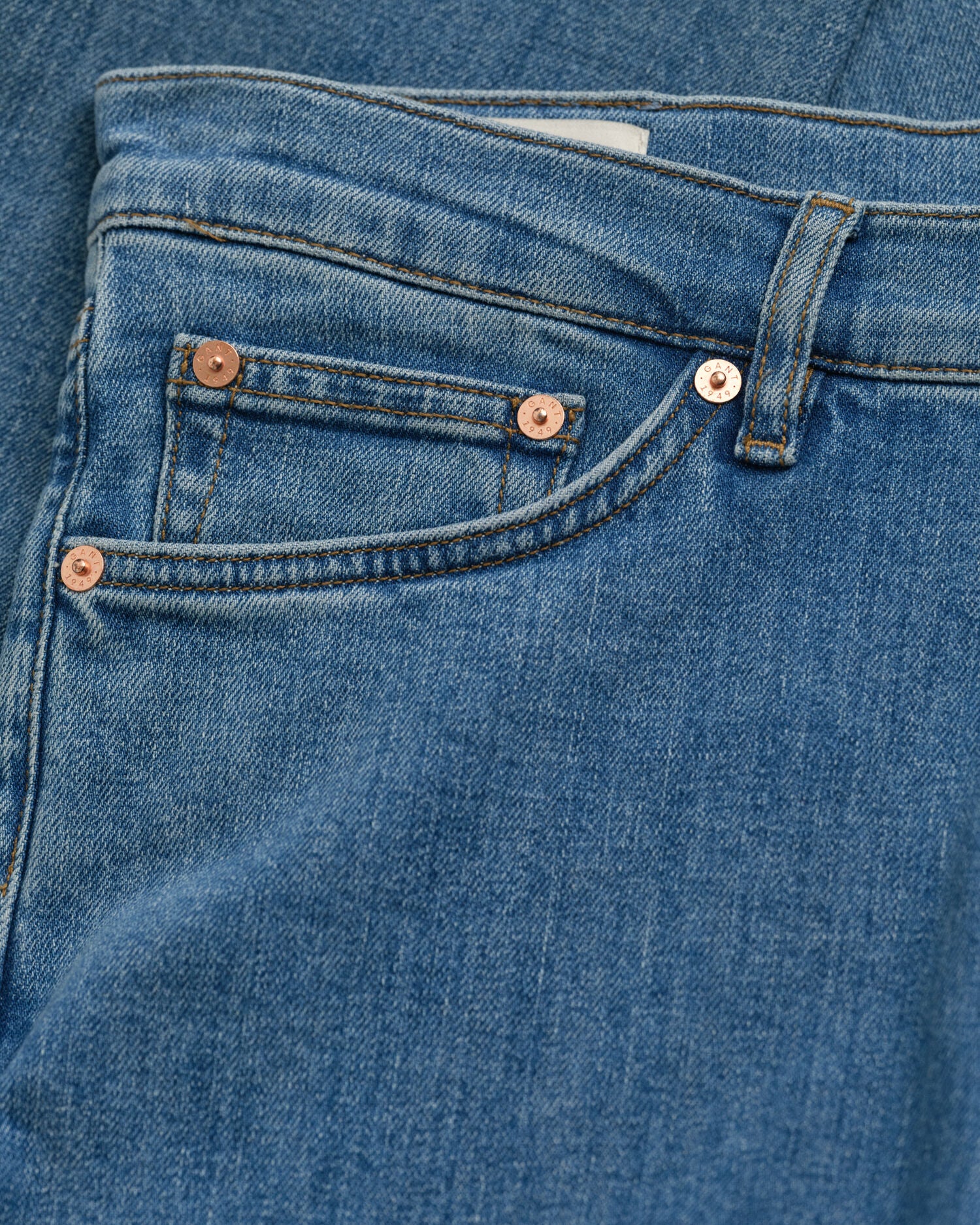 Designed in a clean indigo wash, these jeans are the perfect addition to any seasonal wardrobe. Cut for a slim fit, they have a mid-rise waist and a slim, tapered leg. Made with a classic 5-pocket design and zip fly front, these jeans feature branded shank buttons and rivets as well as a leather logo patch at the back waistband.