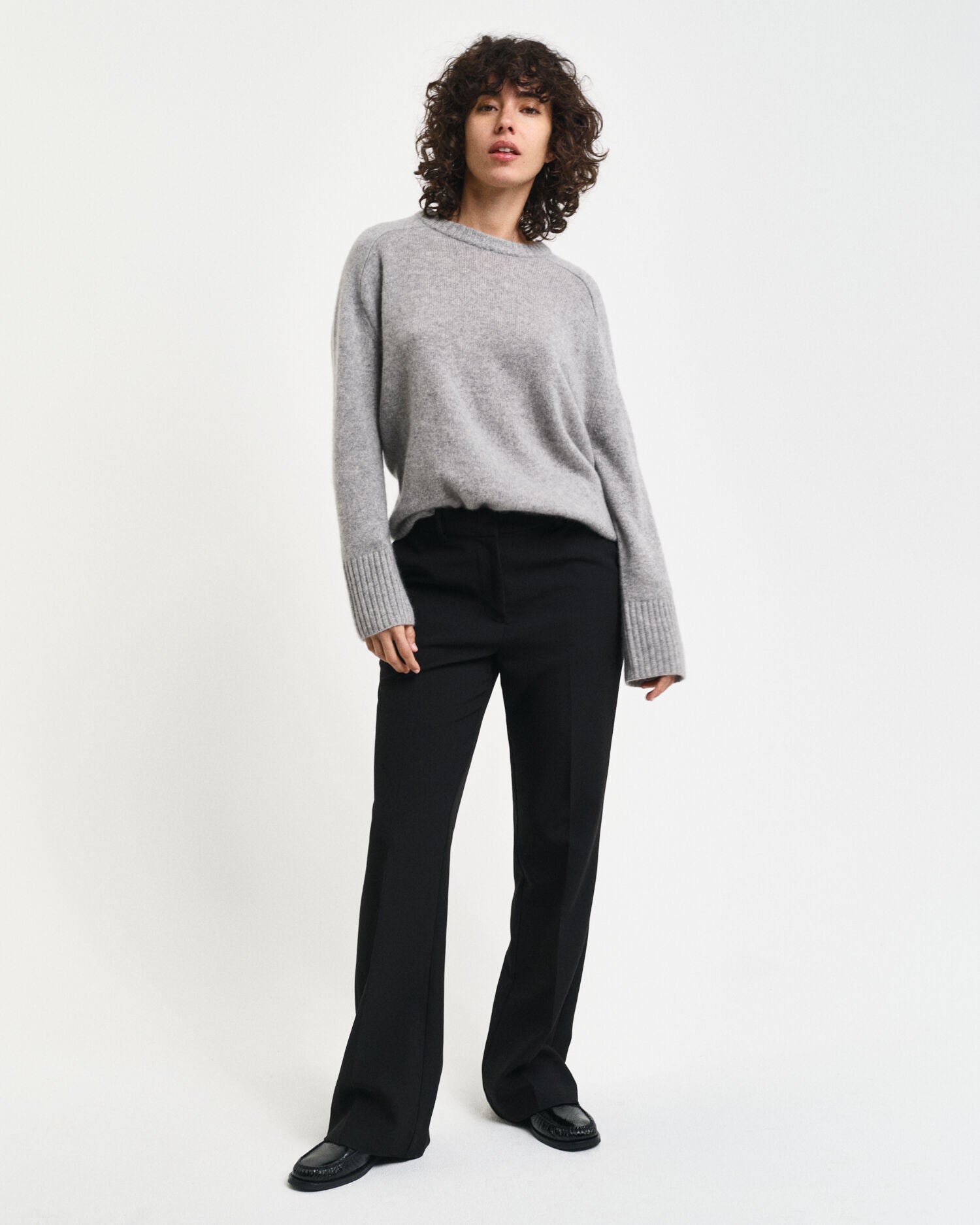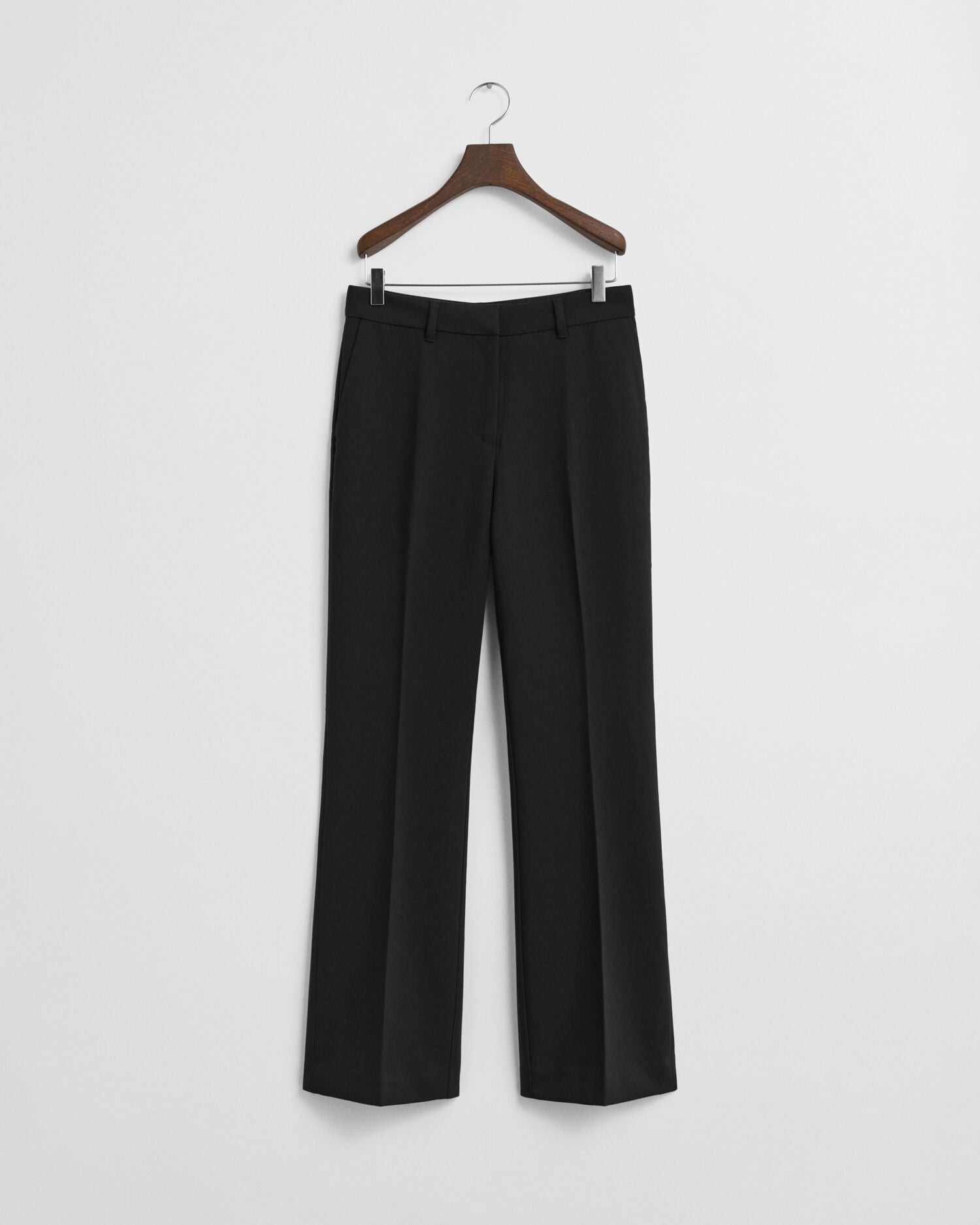 Endlessly wearable, these slacks are crafted with a touch of comfort stretch. Slim over the hips, these pants have a mid-rise waist and a flared leg. Design features include front slanted pockets, back welt pockets, crease detailing and a zip closure with a hook-and-bar fix.