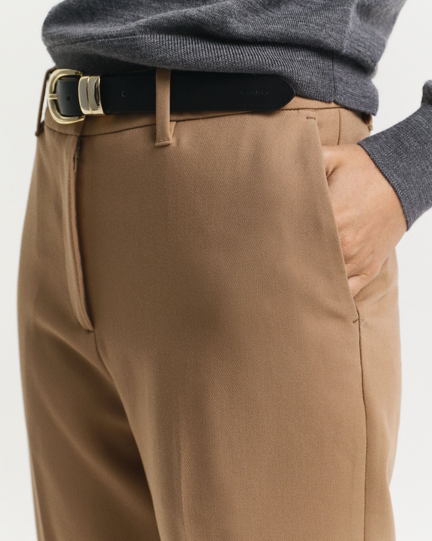 Endlessly wearable, these slacks are crafted with a touch of comfort stretch. Slim over the hips, these pants have a mid-rise waist and a flared leg. Design features include front slanted pockets, back welt pockets, crease detailing and a zip closure with a hook-and-bar fix.