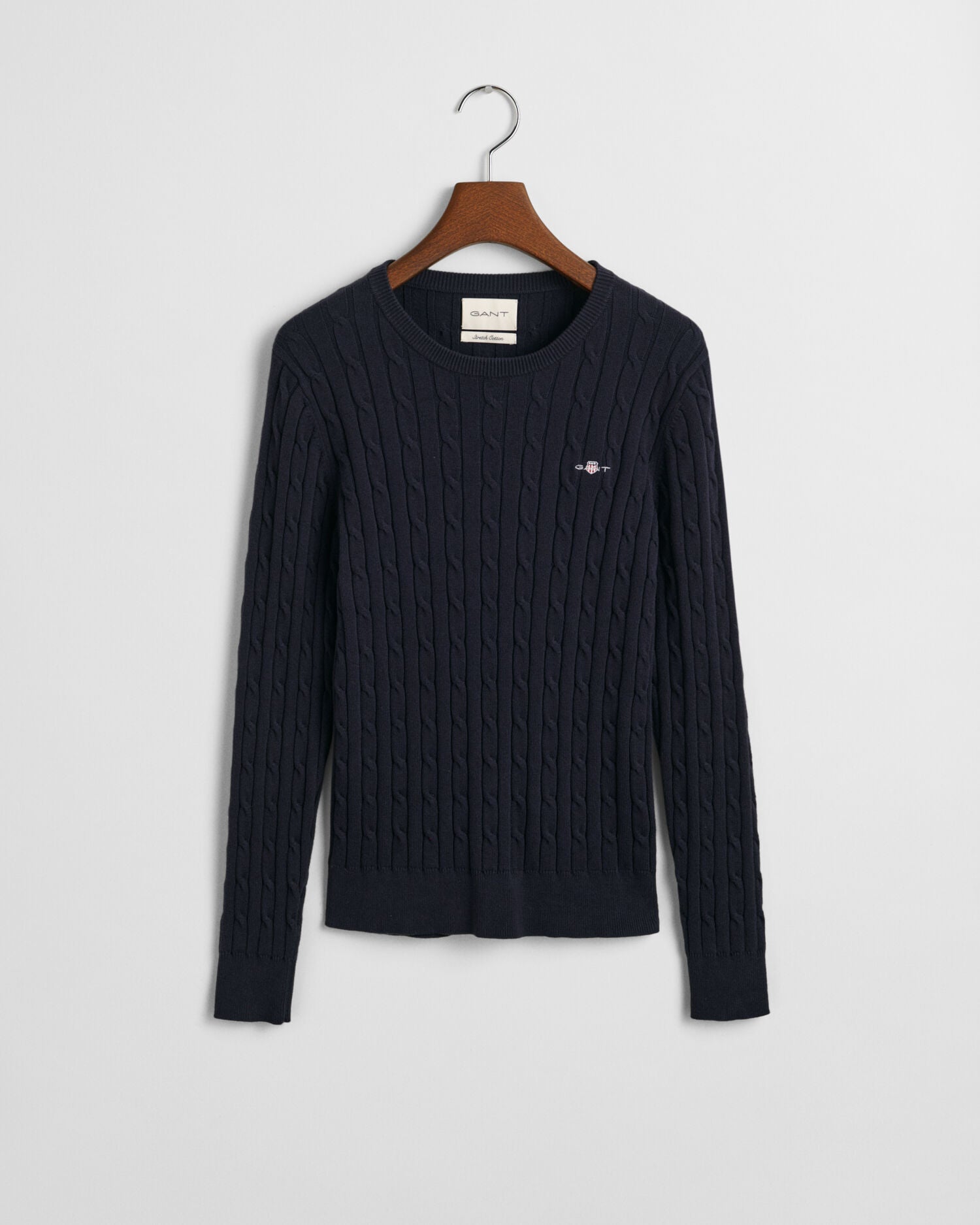 An American sportswear classic, the cable knit sweater has roots with the Aran Islands and Irish fisherman, but has been adored by everyone from Hollywood film stars to boarding school students around the world. Crafted from a soft cotton elastane blend for a slim yet stretchy fit, our version keeps it crisp and versatile with ribbed details, a classic crew neck, and our signature shield graphic embroidered at the chest. Plus, in a range of neutrals and vibrant seasonal hues, you can justify one in every color.