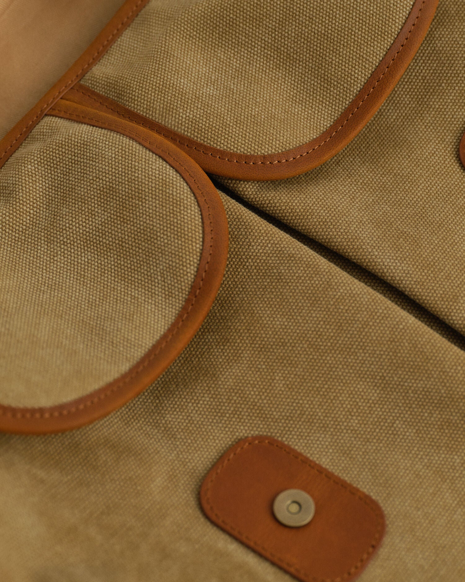 Modeled off a traditional fisherman's bag, this accessory is crafted from washed cotton canvas. It is designed with a fold-over flap that closes using buckles and magnets. This bag features an adjustable shoulder strap, an embossed leather badge at the front and leather detailing throughout the design.