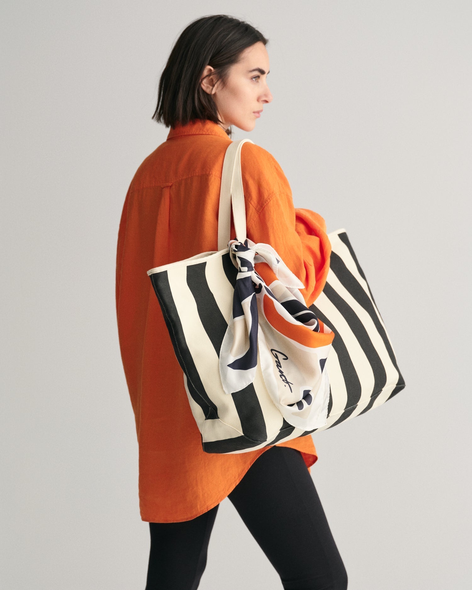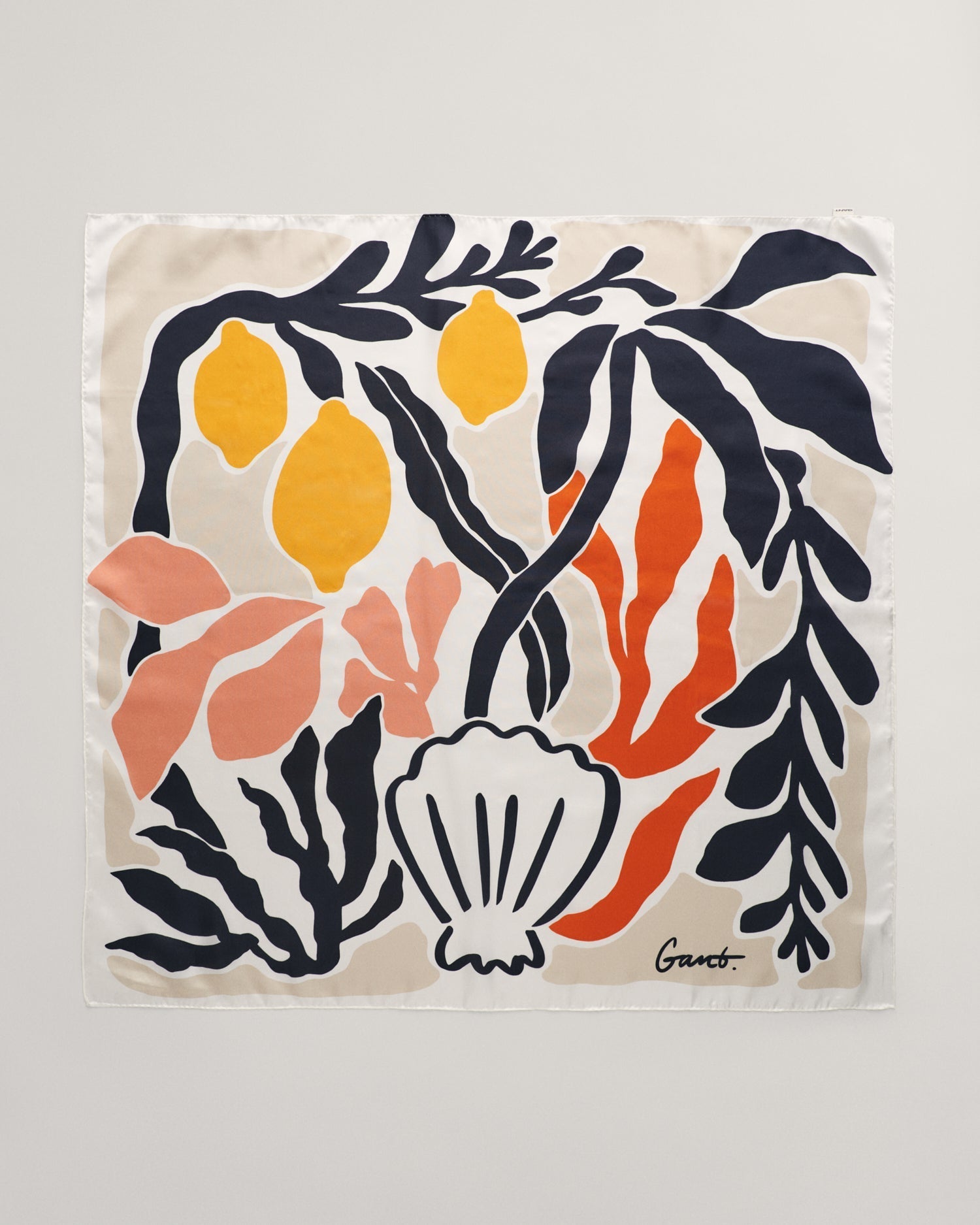 Crafted from 100% silk, this scarf features a palm print with abstract elements depicting seaweed, a palm tree and a simplified seashell. Adding a dose of color to your outfit, this scarf is complete with a signature at the bottom right corner.