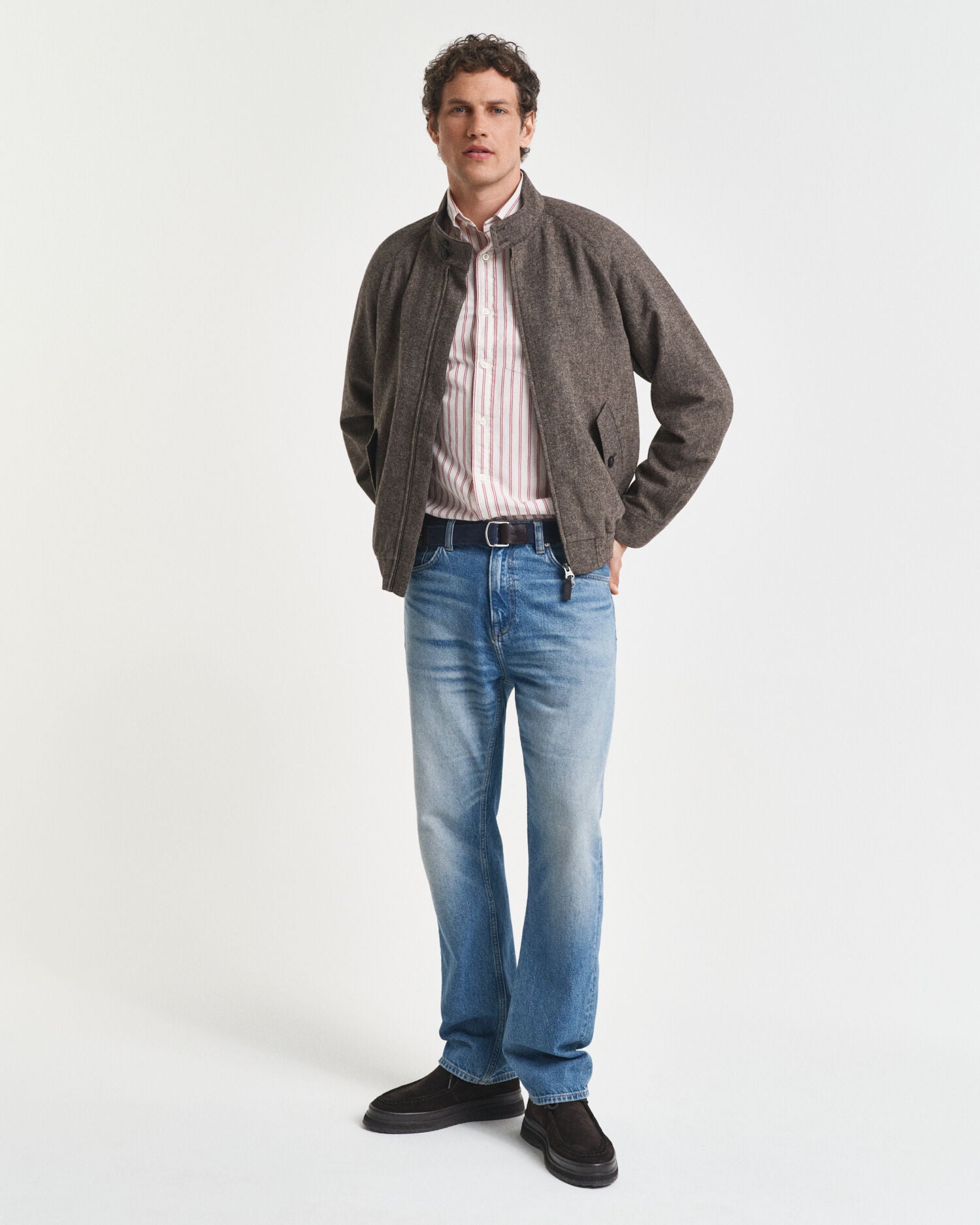 Crafted in a vintage-inspired Harrington style, this jacket is made from a premium wool blend with a herringbone pattern. Cut for a regular fit, it features a stylish stand collar, front zip closure, side flap pockets, and an elasticated waistband. The design is complete with a fully lined interior and two additional pockets.